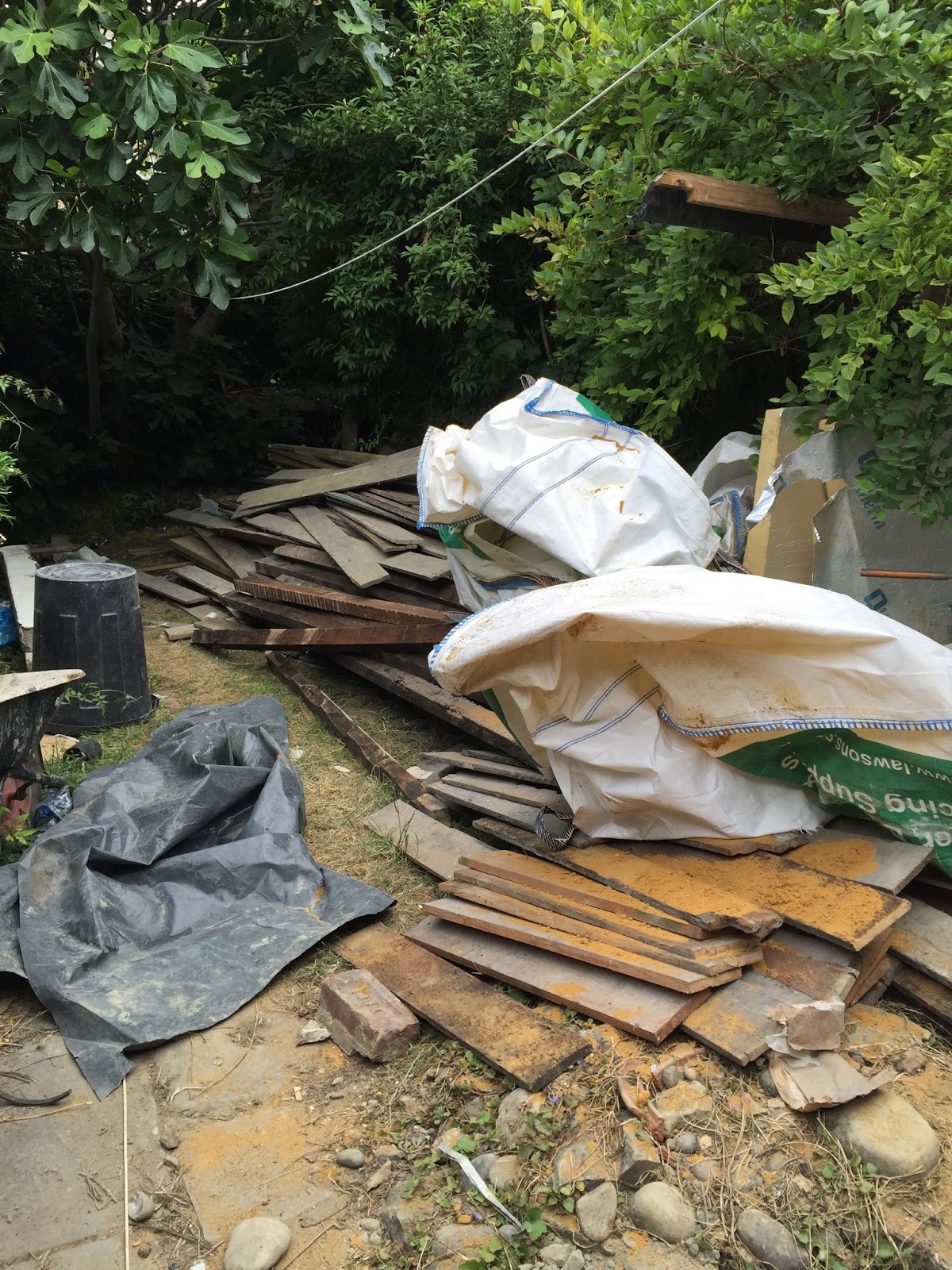 This is the view from Ryan's bedroom looking down into the kitchen and the back garden beyond it. The tarp is covering a long, narrow existing bathroom next to the kitchen. This room will be torn out to make way for the bigger kitchen. Additionally, the open space to the left will also become part of the new kitchen. We are on a narrow lot, so it's only 17 feet wide from one side of the property to the other.
